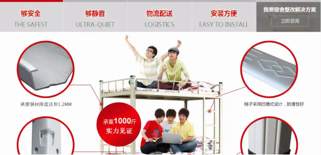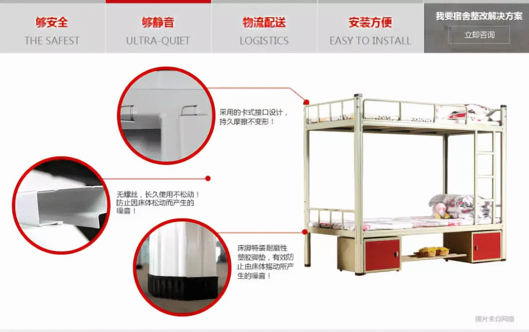 在基本需求后,連盈家具把其鐵架床“夠靜音”與同行差異化出來(lái),“3分鐘能快速安裝好的宿舍床”等“安裝方便”的特點(diǎn);與同行或者同類產(chǎn)品相比,更是獨(dú)勝一籌,連盈宿舍床產(chǎn)品競(jìng)爭(zhēng)力一下突顯出來(lái)!